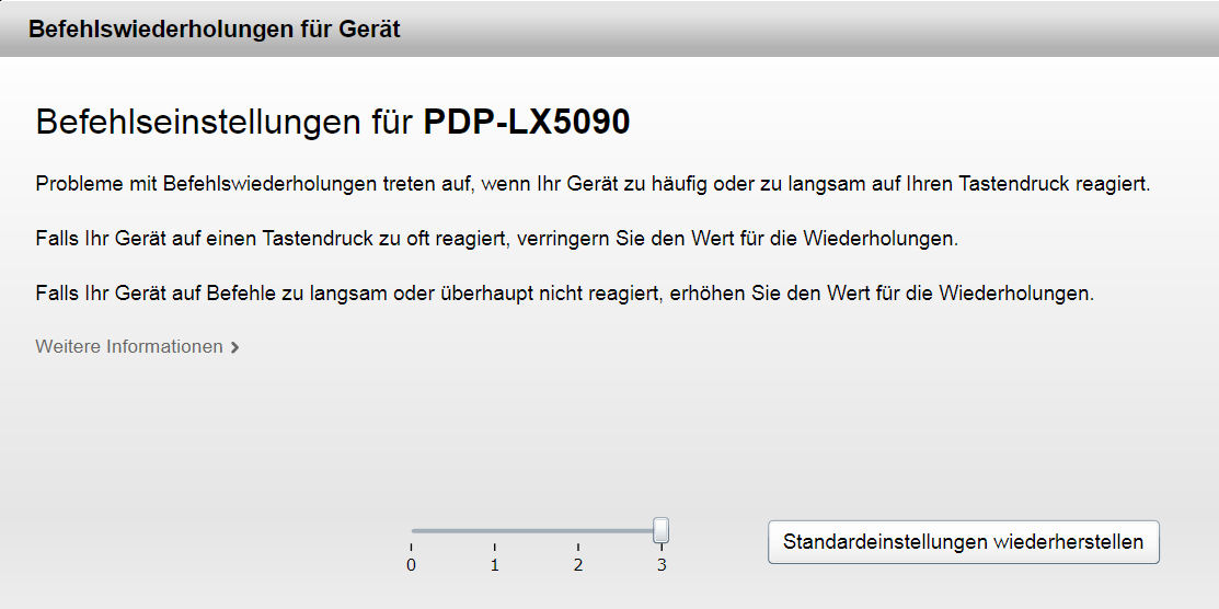 Wenn Befehle zu oft gesendet werden (z.B. Kanal-Wechsel geht nicht in Einzel-Schritten sondern (fast) immer in zwei oder mehr Schritten) liegt dies meist an der zu hohen Sende-Wiederholung.