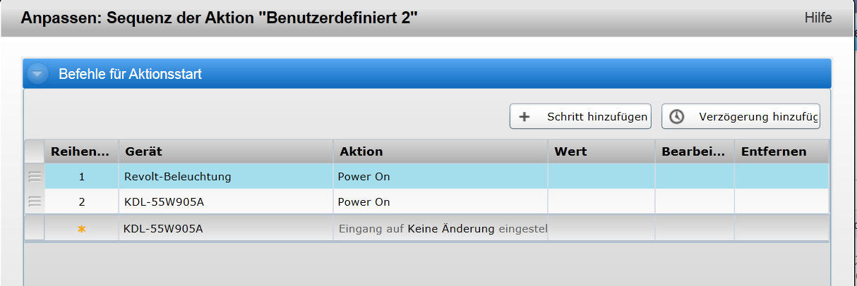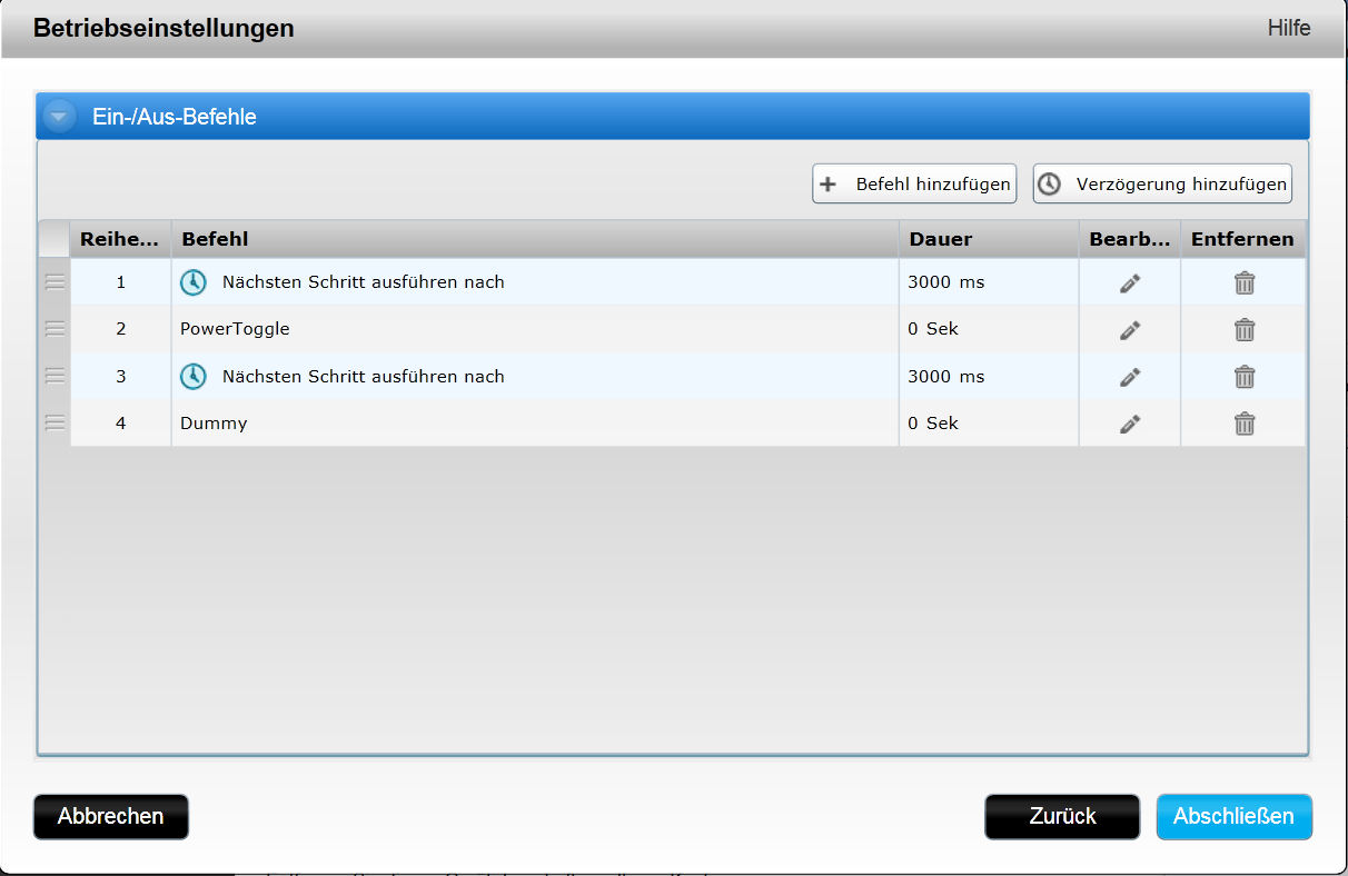 Das sieht dann so aus: Zur Kontrolle unter "Einstellungen anzeigen" muss das alles dann so aussehen: Als Letztes schieben wir den Hauptschalter in der Einschalt-Reihenfolge an die erste und in der Ausschalt-Reihenfolge an die letzte Stelle. Beim Start der Aktion passiert nun folgendes: