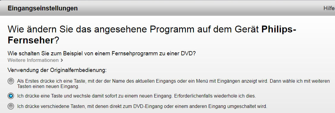 Methode 3: Diese Methode benutzt das Menü des TV's, um den gewünschten Eingang anzusprechen. Sie ist damit schneller als Methode 1, jedoch nicht so schnell wie Methode 2. Voraussetzung für diese Methode ist, dass ein Befehl für den Aufruf des TV-Eingangsmenü's vorhanden ist.