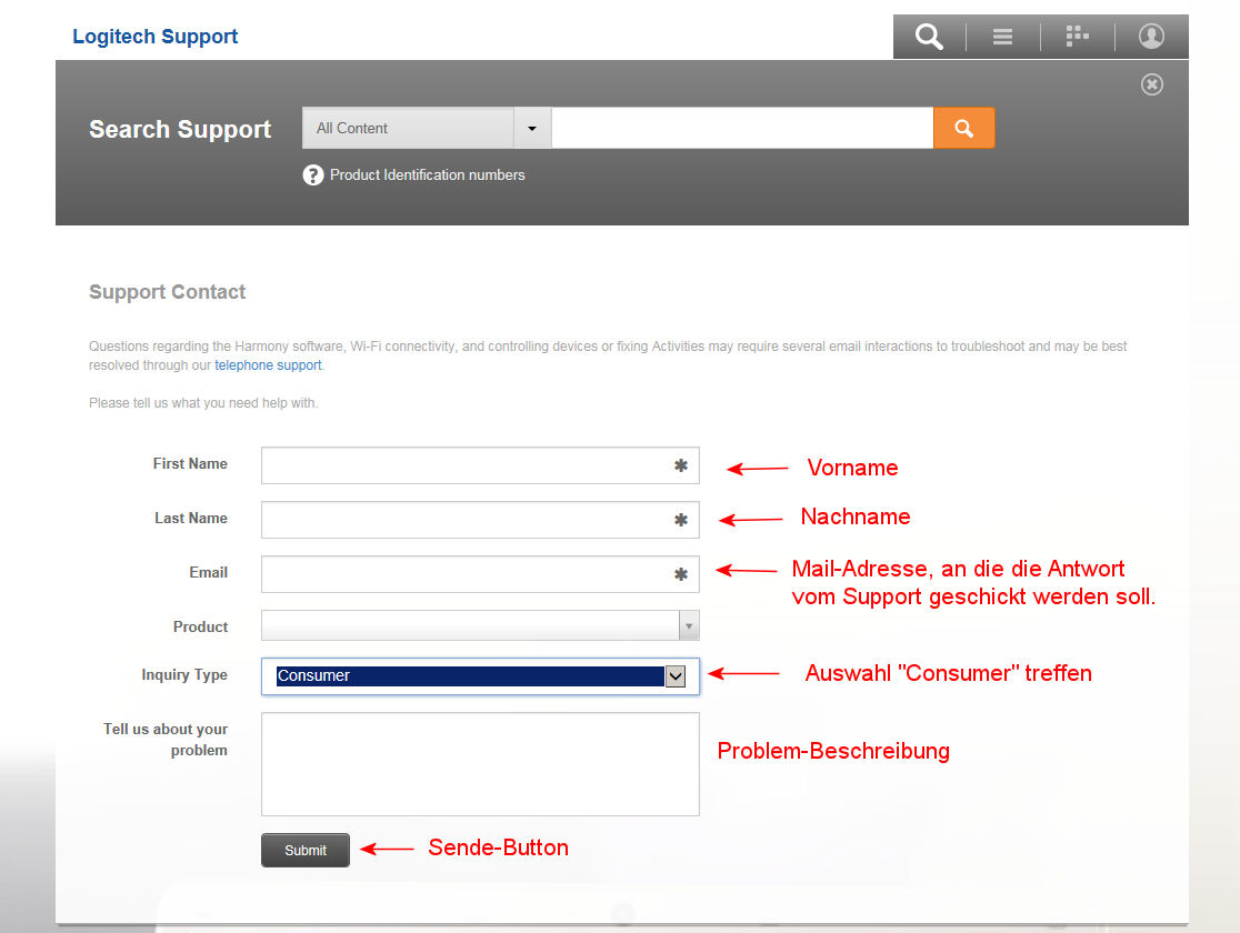 Füllt die Felder aus, gebt Eure Frage eingeben und klickt auf "Submit" zum Senden.