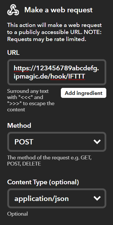 Das ganze schicke ich dann an IPSymconIFTTT mit folgenden Einstellungen