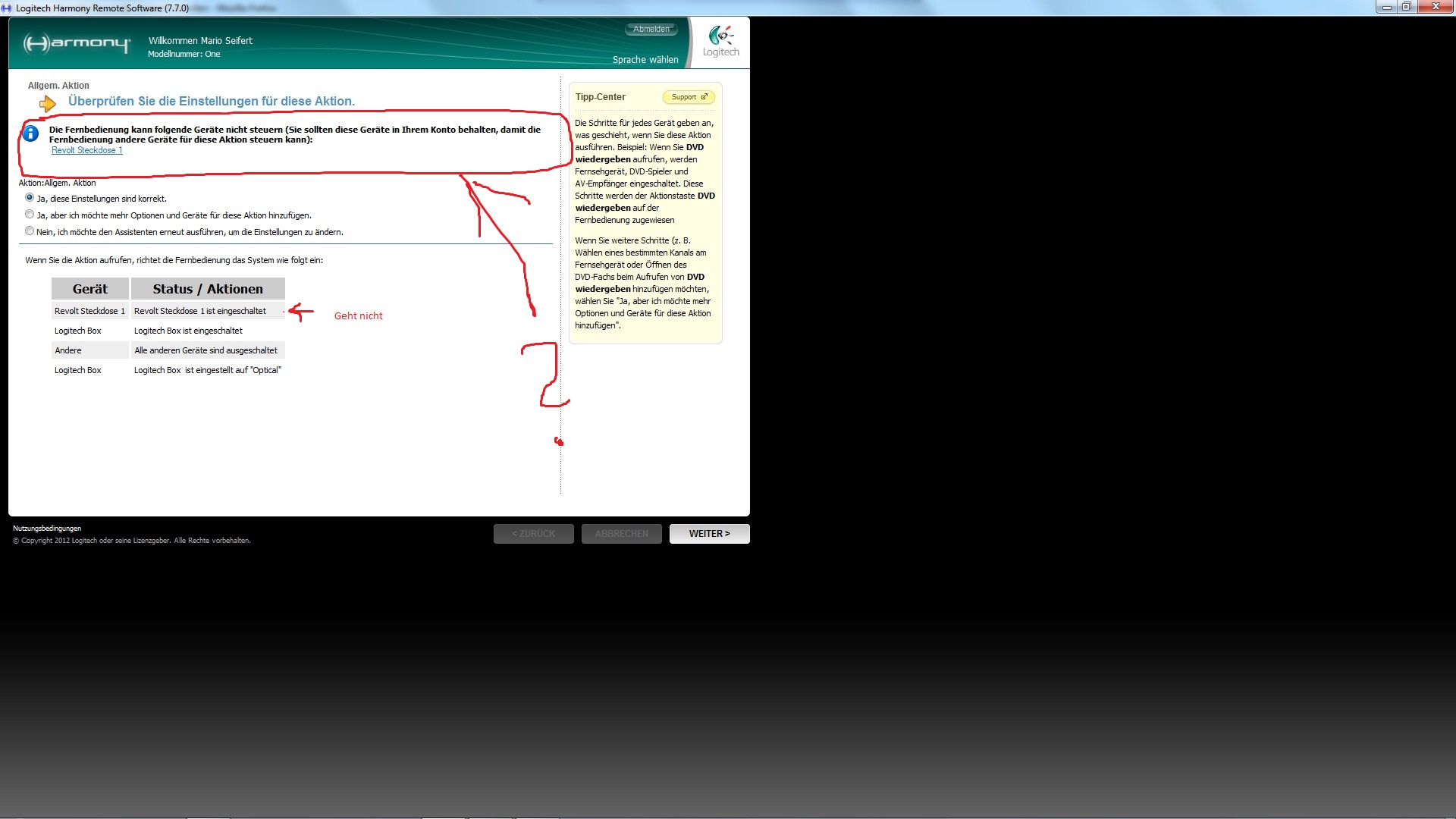 hab dann den befehl auf die Harmony übertragen (Infrarotbefehl anlernen)