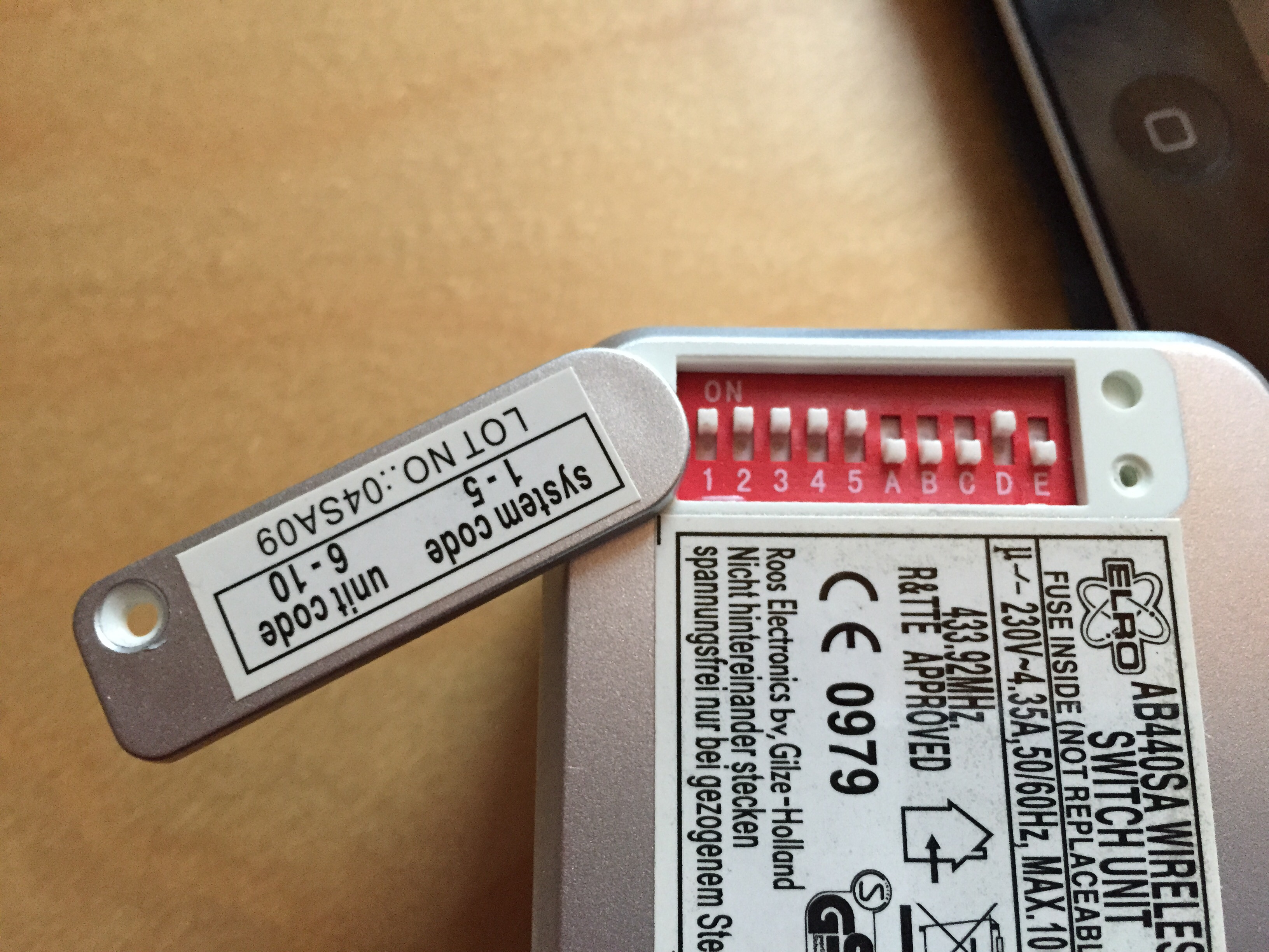 bei mir funktioniert ausschließlich eine Einstellung. Die Dipschalter sind wie im Bild zu sehen eingeschaltet und mit der original Elro Fernbedienung mache ich diese mit der Taste D an/aus.