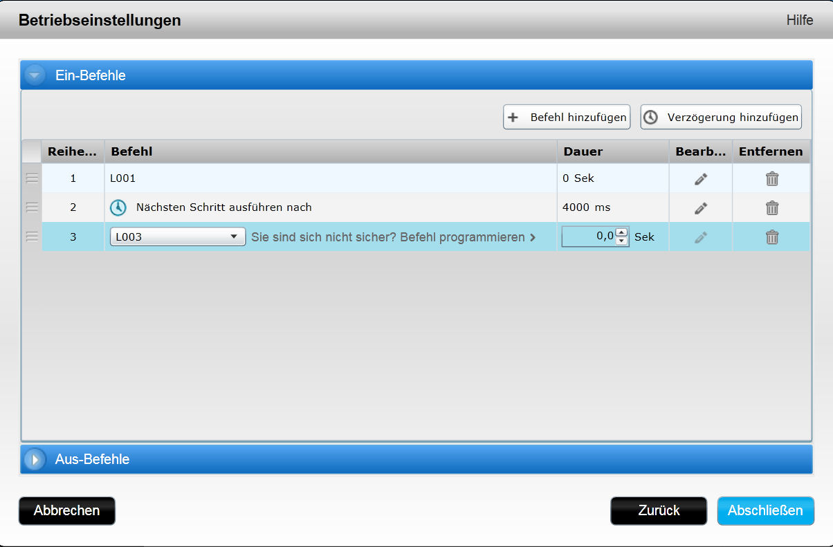 Wenn ich das Gerät "Strom Hifi Wohnzimmer" unter Devices direkt anwähle und dort den Befehl L001 oder L002 wähle schaltet die Steckdose leider auch nicht zuverlässig. Es kommt mir vor, als würde sie "haken". Ich sehe auch erst kein Lichtsignal am Light Manager Air. Erst wenn sie wieder schaltet leuchtet am Light Manager die Kontrolleuchte.