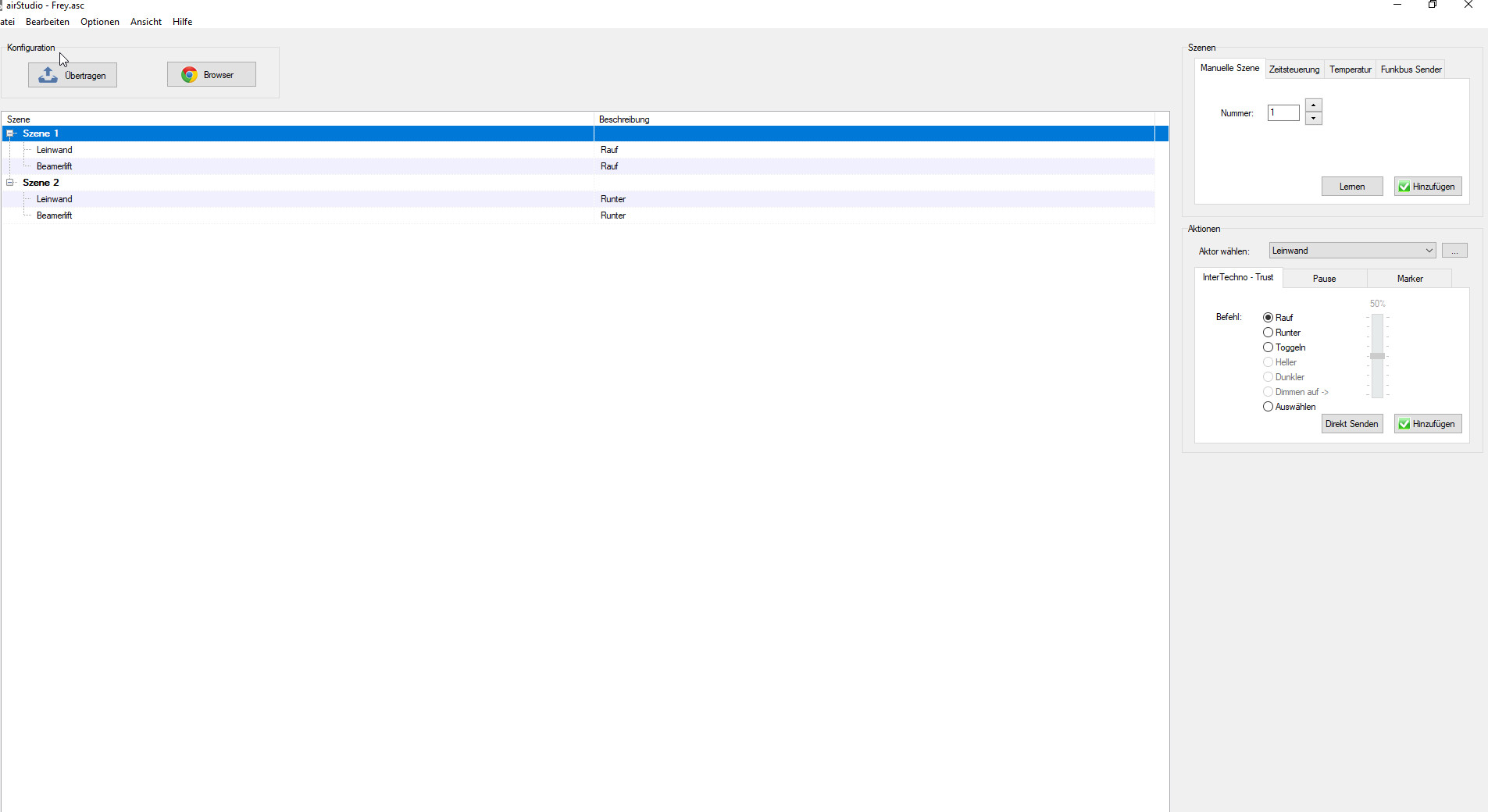 Egal wie ich die Aktion schalte wird sofort anfangs versucht den Beamer zu starten obwohl der ja noch gar kein Infarotsignal empfangen kann da er ja geschlossen in der Decke sitzt. Der Aktor L001 der für den Beamerlift zuständig ist wird nach gedrückter Aktion auf der Fernbedienung erst nach 26 Sekunden aktiv und fährt dann mit dem Beamer herunter. Die Folge ist natürlich das der Beamer ausbleibt :( Im Anhang befindet sich meine bisherige,geschaltete Aktion