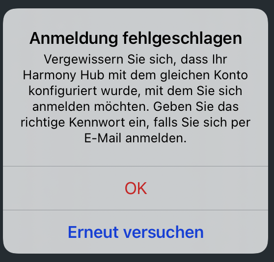 Da kommt so ein tiefschwarzer Bildschirm, bei dem meine korrekte eMail Adresse eingestellt ist und ich das Passwort eingeben muss. Dann erscheint ganz kurz au dem schwarzen Bildschirm so ein drehender Kreis mit einem Text darüber und dann wechselt es auf einen grellen weissen Bildschirm mit einem Großen Rechteck und auch einem drehenden Kreis und einem Text und ca. zwei Minuten später kommt die Meldung, daß die Harmony Server nicht verfügbar sind.
