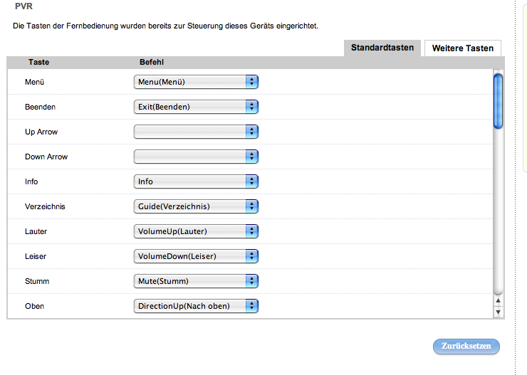 Wie heißen die beiden Tasten ?<< und >>? (gelb umrandet im angehängten Bild) in dem Softwaremenü Tasten anpassen. Ich würde die gerne mit gelernten Infrarotkommandos belegen.