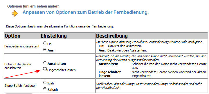 Ihr wollt eine Aufnahme (DVD-Recoder oder Festplatten-Receiver) machen, aber während diese Aufnahme läuft, wollt ihr z.B. eine DVD sehen. Dazu werden die oben erwähnten Geräte nicht benötigt und würden beim Starten der Aktivität "DVD sehen" normalerweise abgeschaltet. Wenn es nun für die Aufnahme aber zwingend erforderlich sein sollte, dass das Aufnahme-Gerät weiter läuft, könnt ihr dies über die oben beschrieben Möglichkeit erreichen.