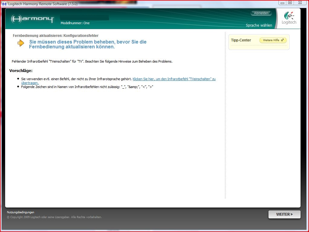 Immer angeben, ob die PC-Software 7.7.0 oder MyHarmony benutzt wird.