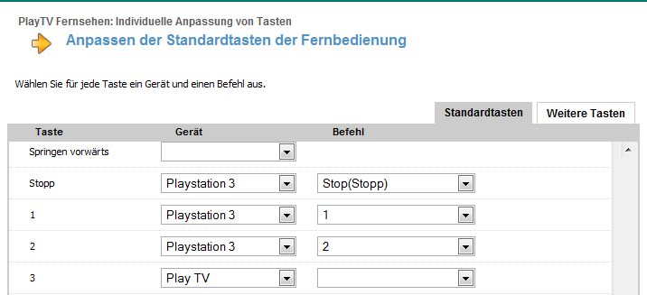 Ich habe das mal als Screenshot angehängt. Die Tastenkonfiguration der Aktion "PlayTV Fernsehen". Stopp, Taste 1, 2 funktionieren, da umgestellt auf die PS3, Standardmäßig ist aber so wie bei Taste 3 gezeigt das Gerät PlayTV der Befehlsempfänger - und das geht nicht.