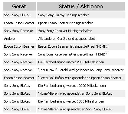 (Das Besondere bei meiner Konfiguration ist, das erst eine Infrarotsteckdose eingeschaltet wird. Daher müssen die Geräte dann noch mal einen "On" Befehl kriegen. Dies sind aber reine "On"-Befehle und nicht "On/Off-Toggles", damit beim um und wieder zurückschalten diese Geräte sich nicht wieder abschalten. Es gibt bei fast allen Geräten irgendeinen Befehl, der die Geräte nur an und nicht wieder ausschaltet, wie z.B. Eingangswahl oder "Home"-Befehl. Die Steckdose geht nicht wieder aus, da es eine Ansmann AES2 ist die sich nur selber ausschaltet, wenn kein Strom mehr gezogen wird.)