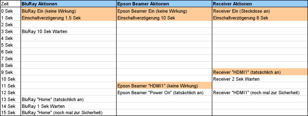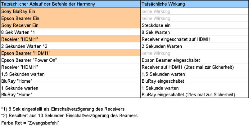 Das, was in der Software als gültige Reihenfolge drin steht und was die Harmony tatsächlich macht, scheint eher unabhängig voneinander zu sein. Nach etlichem rumprobieren bin ich allerdings zu dem Schluss gekommen, das es doch ein gewisses Schema gibt. Man muss sich die Aktionen eher parallel pro Gerät vorstellen als seriell für alle Geräte. Das folgende Beispiel gilt für meine eigene Konfiguration. Was die genau macht, ist ja nicht weiter wichtig, es geht ja nur um die Visualisierung der tatsächlichen Reihenfolge.