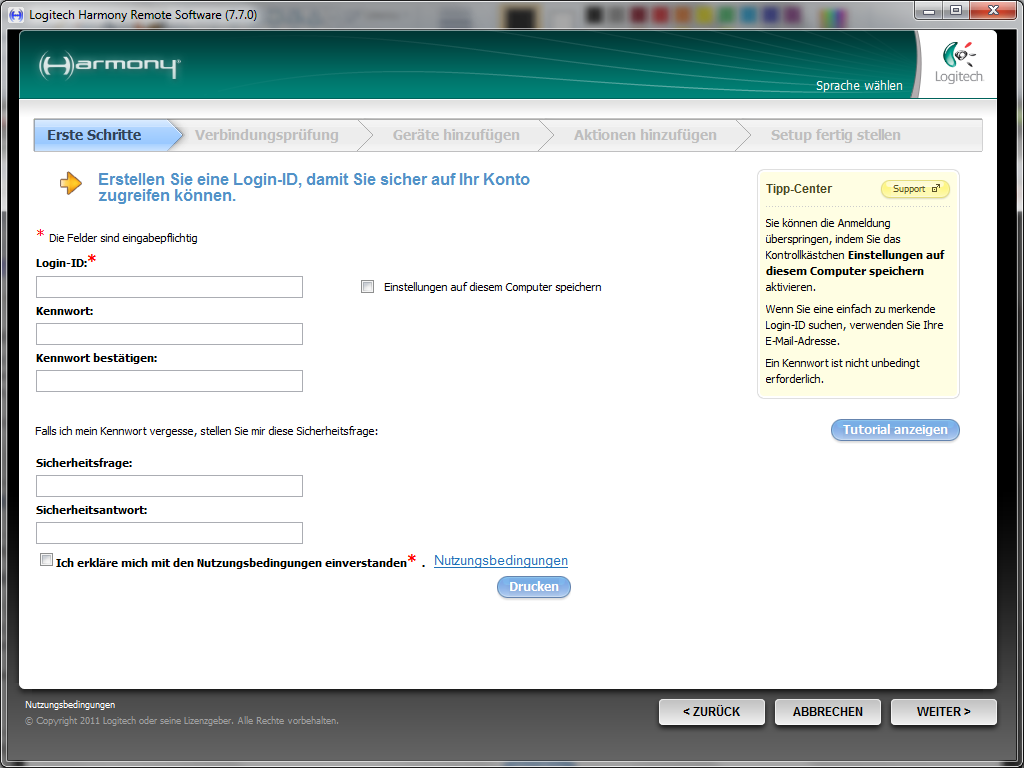 wie gesagt, ich habe kein Benutzerkonto erstellt, lediglich den Haken in dem Kästchen "lokal auf diesem Computer verwenden" gesetzt (Tipp von der SW hat mich drauf hingewiesen) und danach dann die Konfiguration für meine Geräte erstellt. Es war kein Login, Passwort oder irgendeine Registrierung notwendig.
