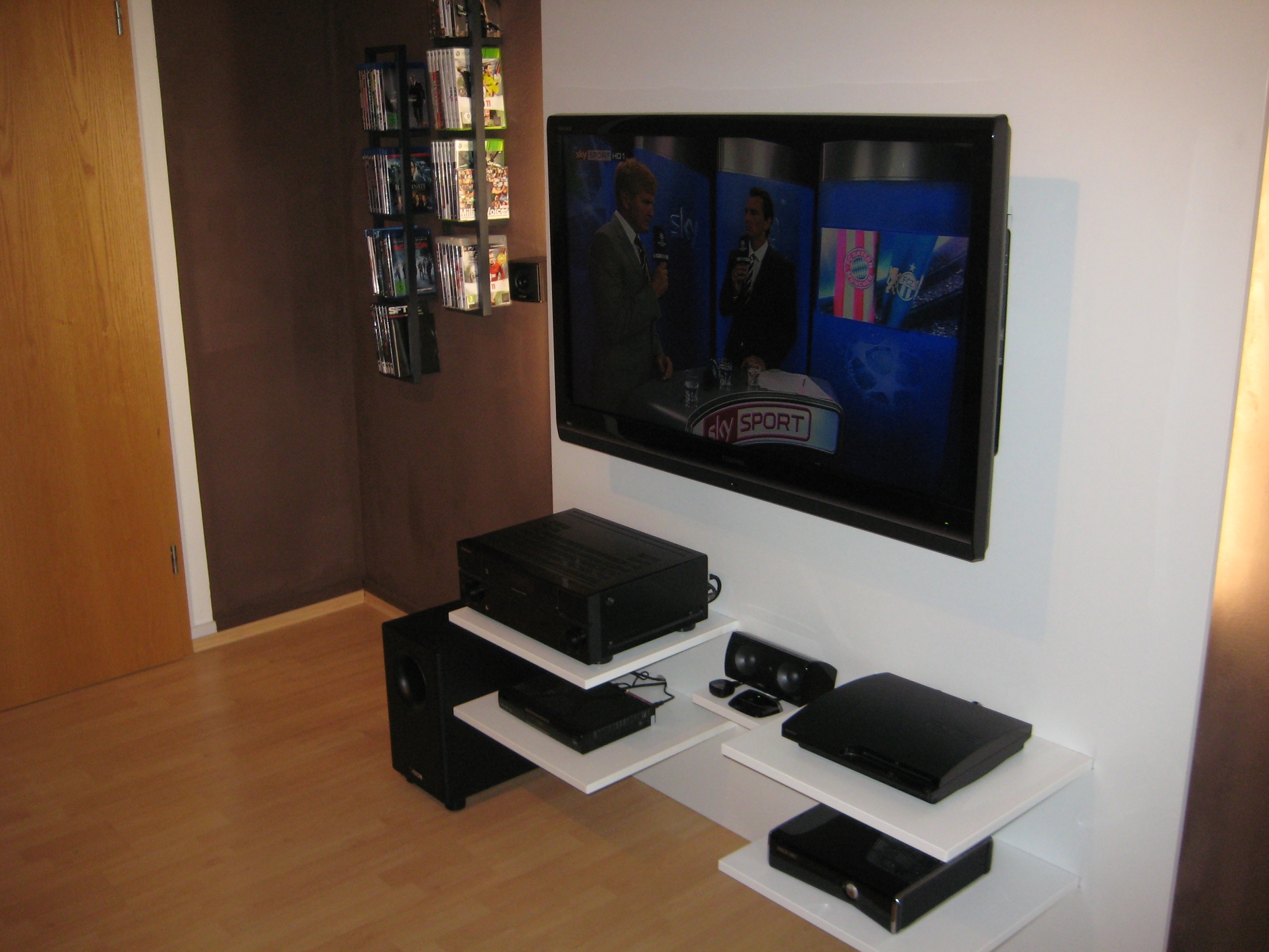 also die Platten wurden komplett von mir vermessen inkl. der Auslass für die Wandhalterung für den TV + die Schlitze für die Bodenplatten der Geräte. Diese wurden direkt an der Wand mit Winkeln montiert. Dadurch muss das Material keine Last tragen.