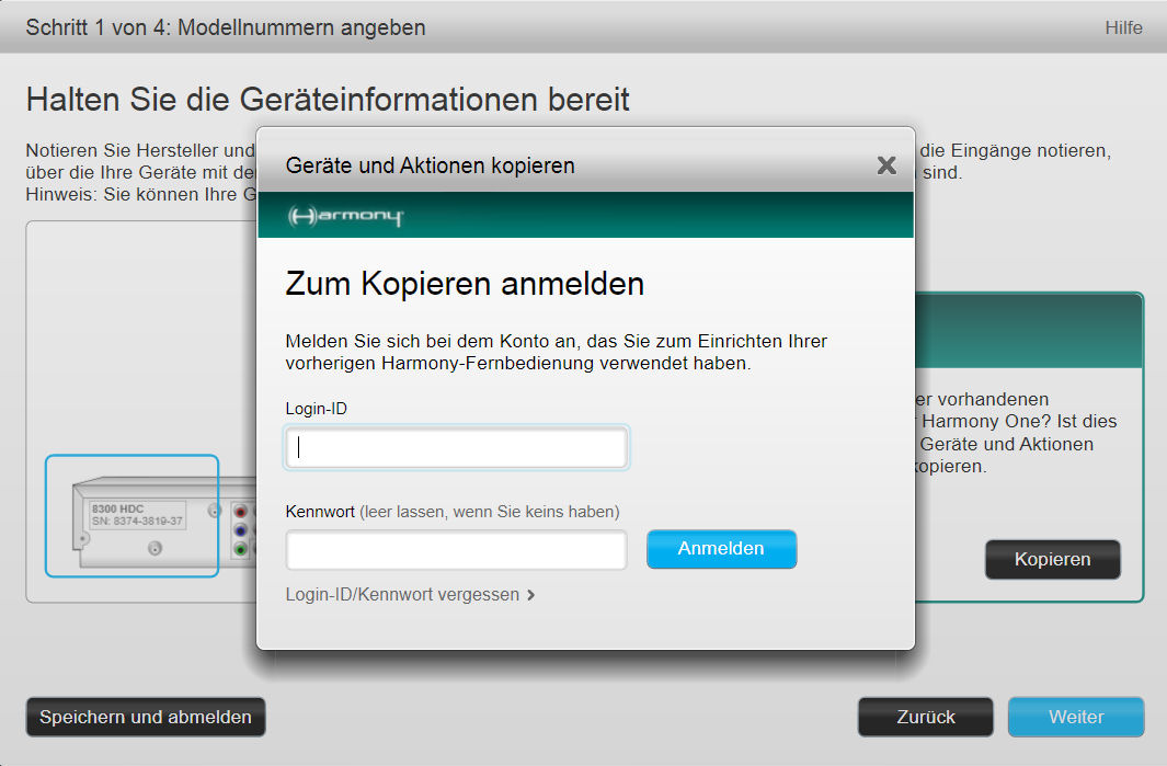 Gebt im Folge-Fenster die Anmelde-Daten des zu importierenden Konto's an und wählt ggf. die zu importierende Harmony aus [nur bei myharmony.com, sofern mehr als nur eine Harmony in diesem Konto ist]. Den Rest macht die Software: