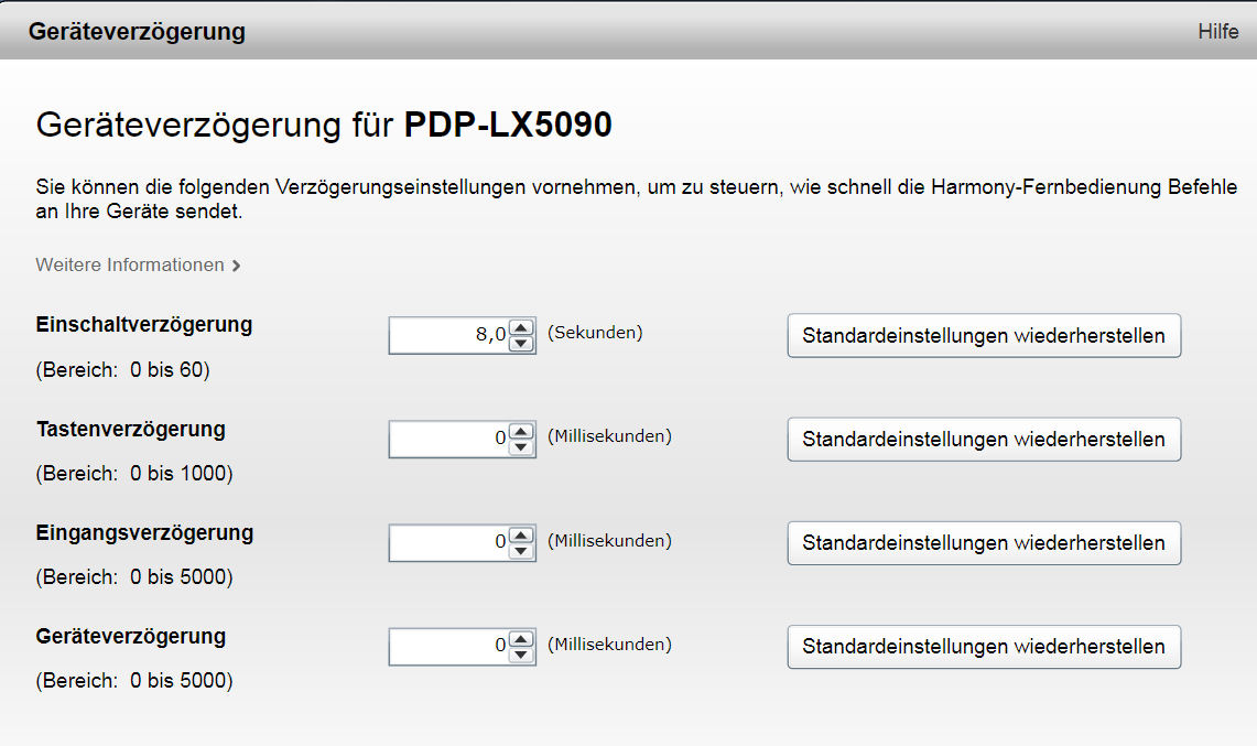 Wenn ein Infrarotbefehl an ein bestimmtes Gerät gesendet wird, empfängt jedes Gerät im System den Befehl, aber nur ein Gerät reagiert darauf. Die anderen Geräte ignorieren den Befehl. In bestimmten Fällen ignoriert ein Gerät einen Befehl für ein anderes Gerät und akzeptiert danach kurze Zeit lang keine eigenen Befehle. Diese Zeitspanne wird als Geräteverzögerung bezeichnet, während der die Fernbedienung keine Infrarotsignale erzeugt. In seltenen Fällen kann diese Verzögerung mehrere Sekunden lang sein.