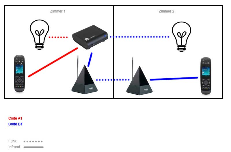 1. Der Zweck ist, mit nur einer Harmony und einem Light-Manager die Beleuchtung von zwei Räumen zu kontrollieren.