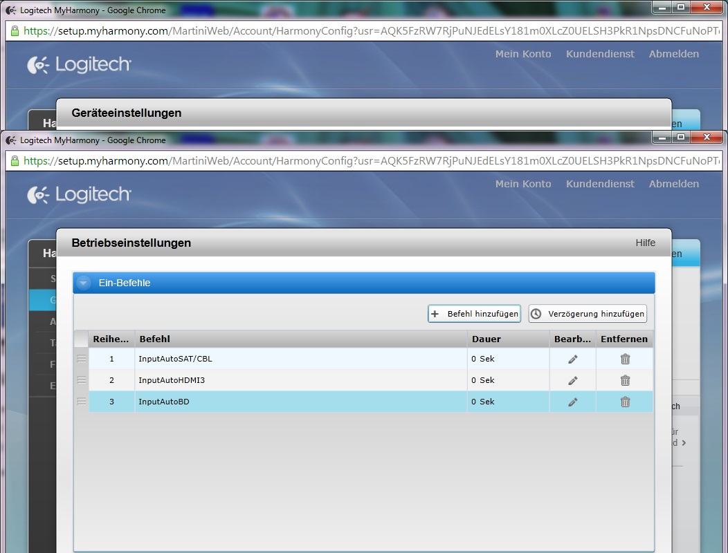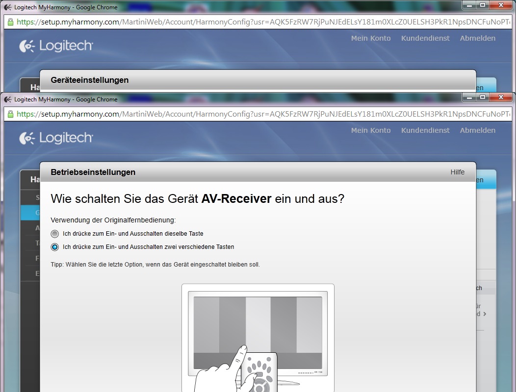 Und das soll auch mit MyHarmony.com funktionieren? Ich finde unter den Betriebseinstellungen nichts bzgl. Unterchiedlicher Ein/Ausschaltbefehle. Ich kann zwar einen anderen Einschaltbefehl definieren oder auch mehrere - aber dann werden diese alle der Reihe nach gesendet.