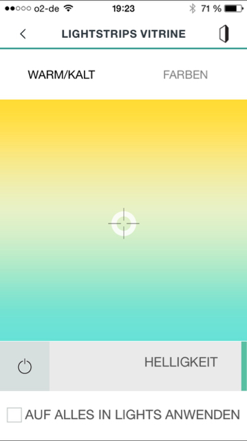 Danke für die Antwort. Heißt, das es geht nur die Frabtemperatur (warmweiß bis kaltweiß), aber nicht die Farbe?Perlbo hat geschrieben:Helligkeit und Farbe über Balken. An aus. Ich war froh mir die hue taps geholt zu haben. Habe keine vernünftige Option gefunden Lampen einzeln (wie in hur App) farblich zu steuern.