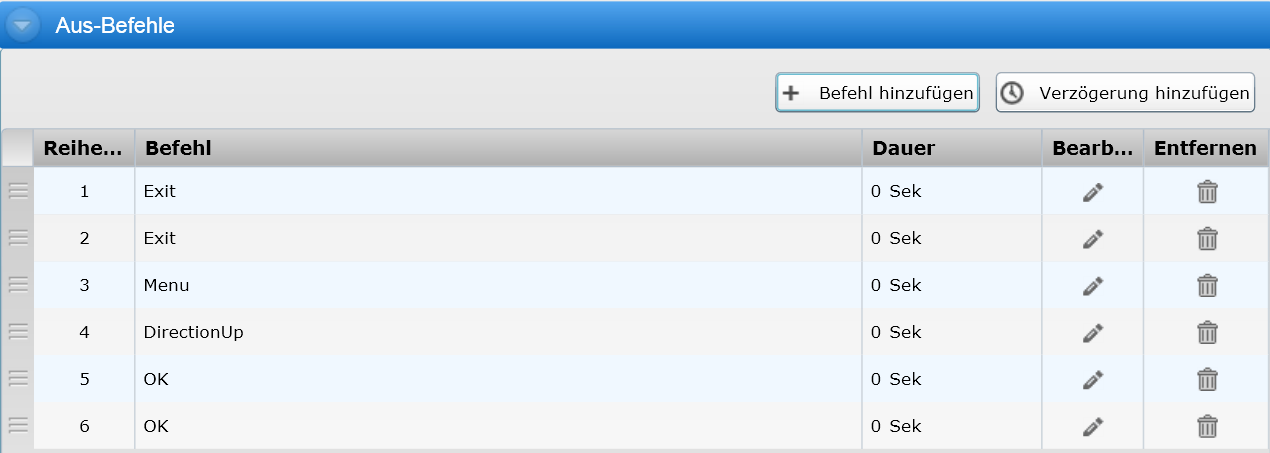 Wenn man hinterlegt, dass das Gerät ein und ausgeschaltet werden kann, dann erscheint in einer Sequenz mit diesem Gerät der PowerOn bei der Einschaltsequenz und PowerOff bei der Ausschaltsequenz. Diese Befehle sind dann allerdings nicht deaktivier / löschbar.