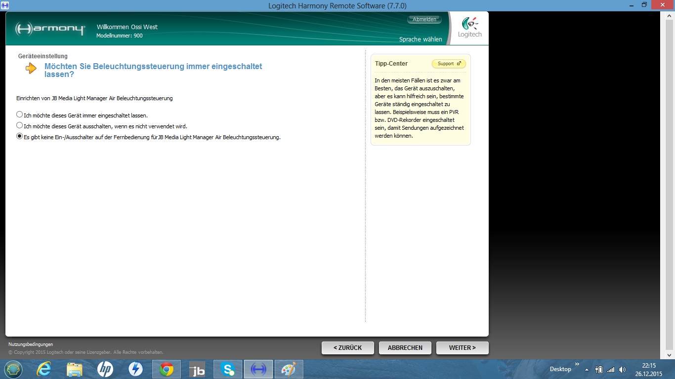 Harmony FAQ | Betriebs-EinstellungenIn deinem Fall dann auf "Ich möchte das Gerät ausschalten, wenn es nicht genutzt wird" ändern und dann im nächsten Schritt die getrennten Ein- und Ausschaltbefehle festlegen.