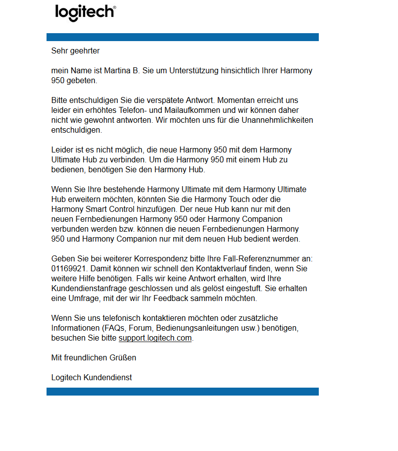 Ich finde das Vorgehen von Logitech etwas daneben. Das weder der "alte" noch der "neue" HUB mit der 950er kommuniziert