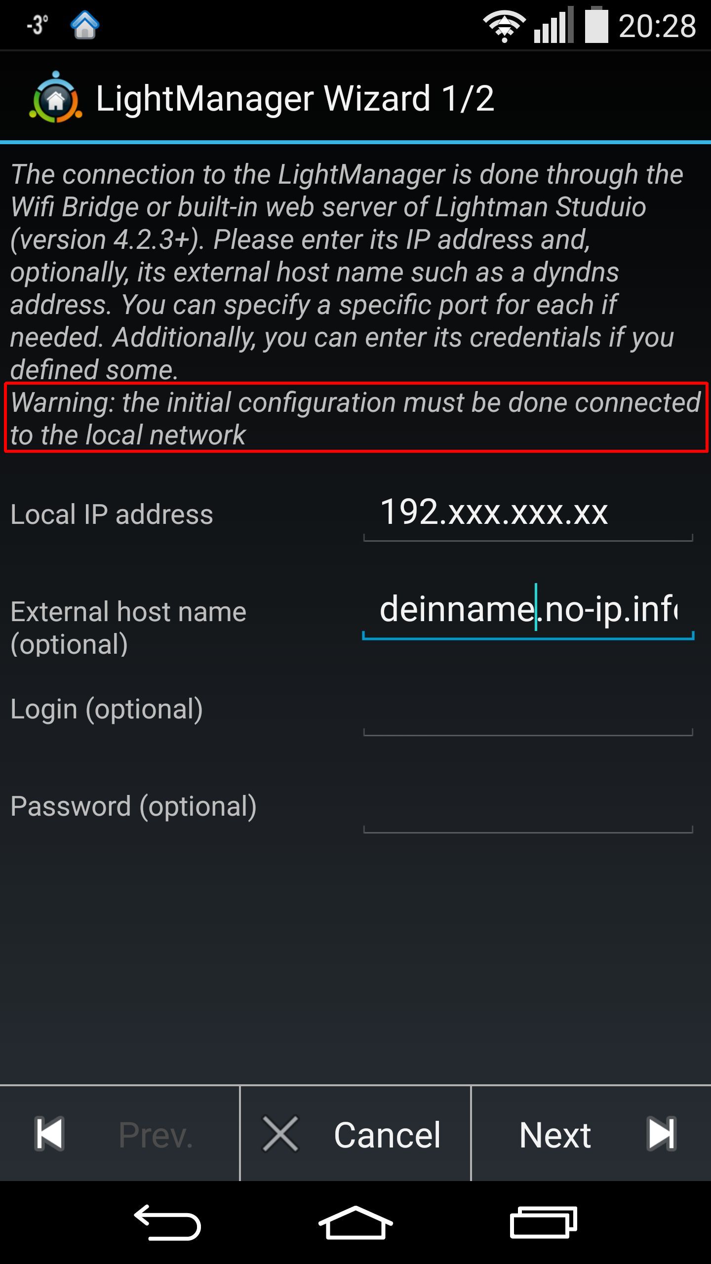 fritz.box Einstellung habe ich genauso. IP des light managers habe ich auch eingetragen. Bei external host name hatte ich: