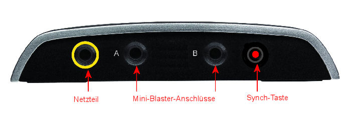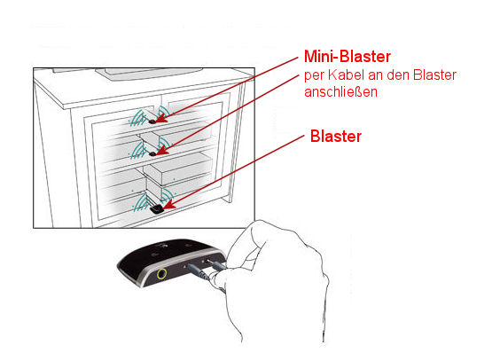 Der Blaster kommuniziert per Funk mit der Harmony. Er braucht daher auch keine Sichtverbindung zur Harmony und kann daher in einem Schrank oder auch in einem anderen Raum platziert werden.