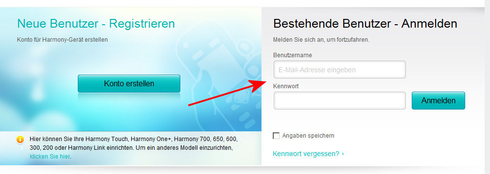 http://myharmony.com/MartiniWeb/Account/HarmonyConfigMan ist ab sofort also gezwungen, myharmony.com im Browser aufzurufen und dann auf der rechten Seite seine Konto-Daten einzugeben: Danach geht's dann -so Logitech will- in's Konto.