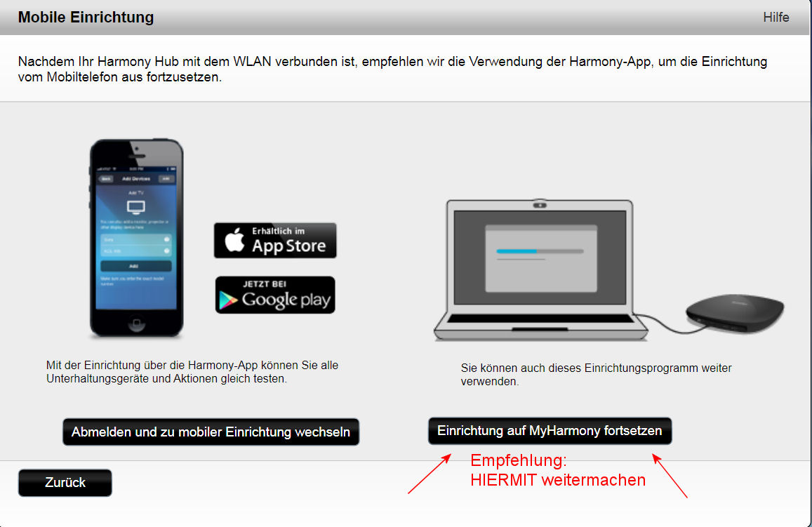 Achtung: In dieser Anleitung beziehe ich mich auf die Smart Control, weil diese alle Bereiche der Ersteinrichtung durchläuft, während andere Harmony's (z.b. die 650) einiges nicht benötigt (Beispiel: WLAN-Einrichtung).