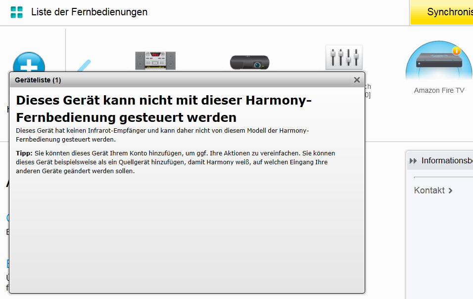 Wenn es aber stimmen sollte, geht die Steuerung mit der Harmony nicht.