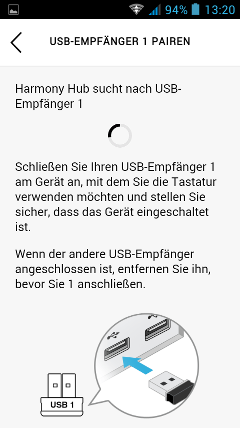 Begonnen wird mit USB-Empfänger 1: Der Hub sucht solange, bis er diesen USB-Empfänger gefunden hat.