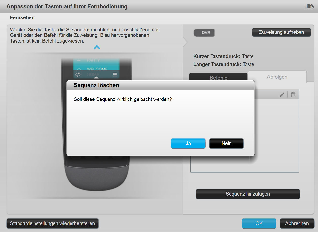 Jetzt packen wir diese Sequenz auf die Fest-Tasten-Funktion -kurz oder lang- , deren Belegung wir löschen wollen.