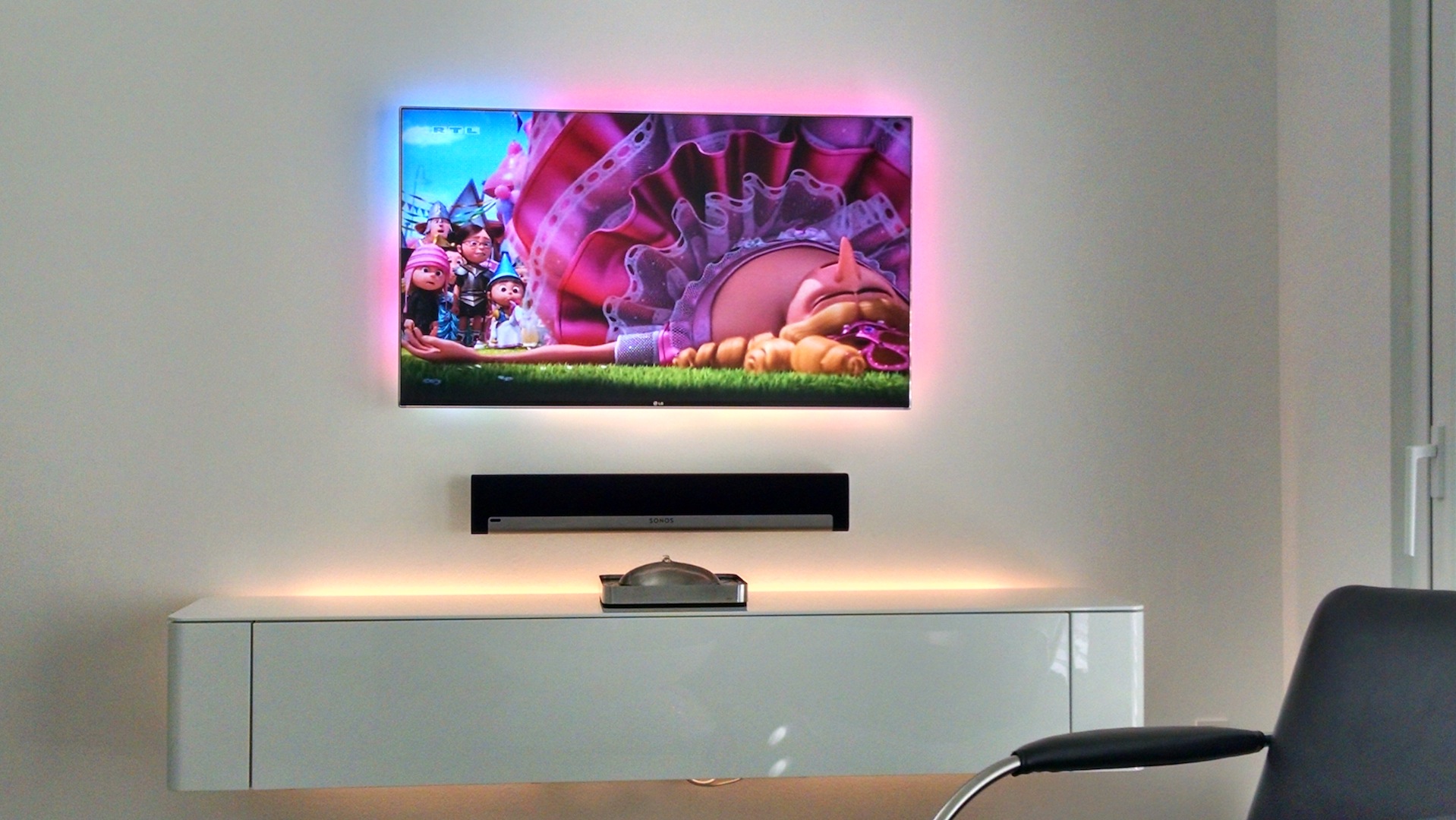 Da nun endlich ein passendes Lowboard mit Wandmontage gefunden habe, ist meine bescheidene Fernsehecke nun endlich fertig.