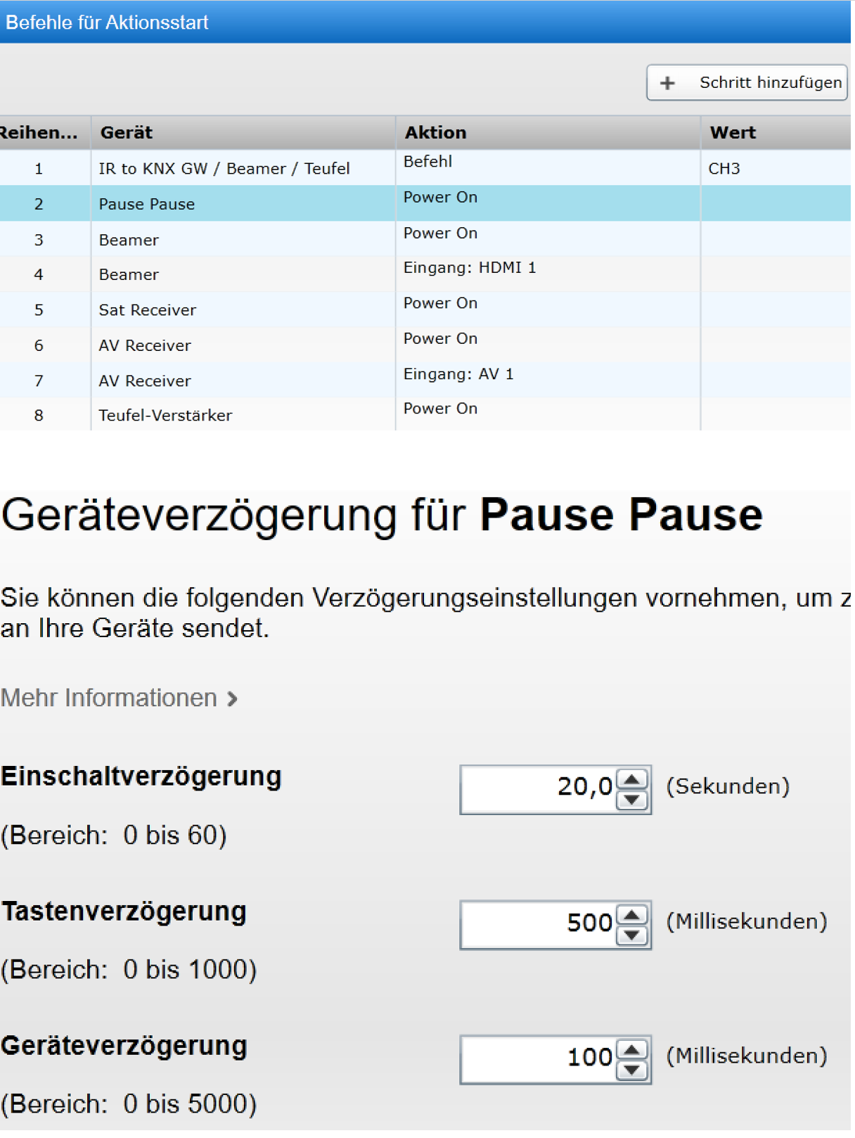 leg dir ein neues Gerät an das Du nicht hast und nenne es Pause. Welches ist egal. Dieses Gerät fügst Du der Aktion hinzu und packst es nach KNX (Lift) und vor Beamer. Bei diesem Gerät gehst Du in die Einstellungen, Betriebseinstellungen, "Ich möchte das Gerät ausschalten wenn nicht verwendet", "Ich drücke 2 Tasten für ein/aus". Jetzt kannst Du für das Gerät, das Du nicht wirklich hast, Sequenzen definieren die beim Start/Ende einer Aktion benutzt werden. Für Power On definiere "Pause 20, Power on" und für Power Off einfach "Power off".