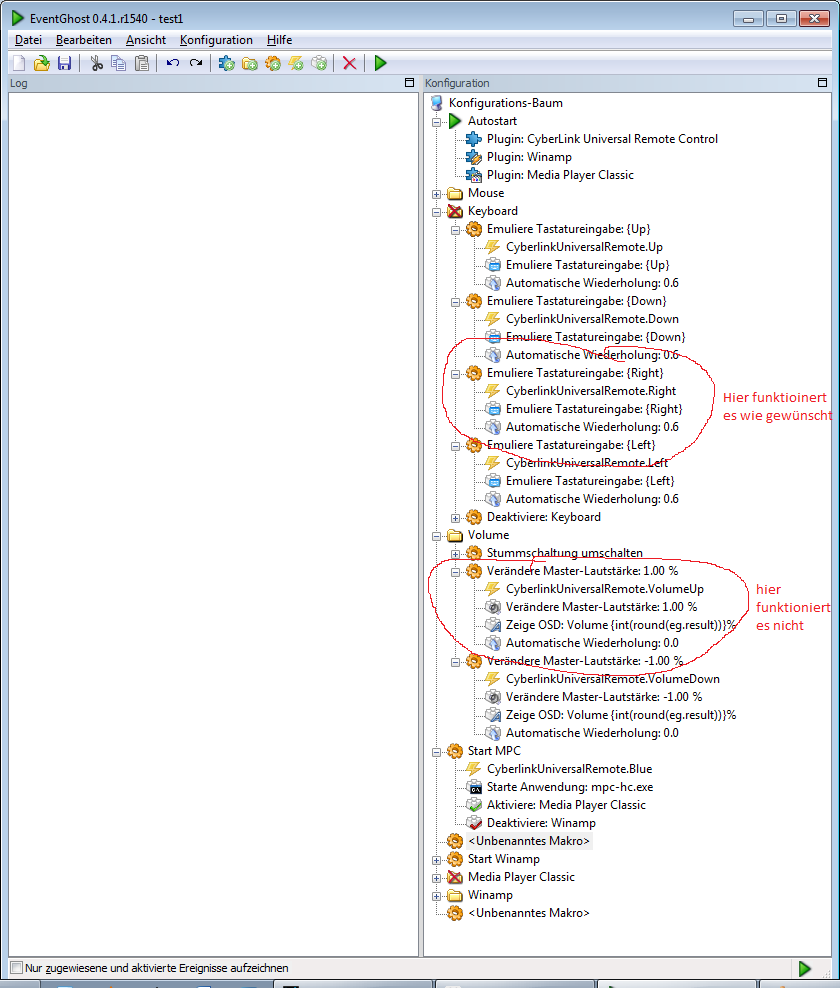 ich wollte mit der One Eventghost nutzen um den PC zu steuern (Empfänger ist von der Cyberlink Universal Remote), klappt soweit alles ganz gut, einziges Problem im Moment die Lautstärkereglung. Ich wollte mit automatischer Wiederholung in EG arbeiten --> langer Tastendruck, die Lautstärke wird kontinuierlich erhöht (das Makro sollte so lange wiederholt werden, wie ich die Taste drücke). Leider bricht die ganze Angelegenheit immer ab, bei den Cursortasten funktioniert alles super nur bei Lautstärke und Channel nicht. Stimmt was mit den Timings nicht, kann die One das nicht, ist da eventuell was defekt? Woran könnte es sonst noch liegen? Hoffe jemand weiß Rat.