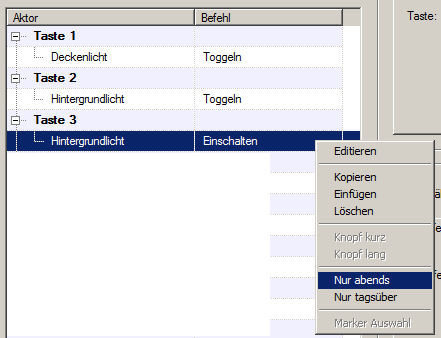 Ausgangssituation für die weitere Einstellung ist, dass wir jeweils eine Taste zum Ein- und Auschalten der Hintergrund-Beleuchtung definiert haben: Im ersten Schritt setzen wir die Taste 3 (Einschalten) auf "Nur abends" (rechte Maustaste auf den Aktor): Das sieht dann so aus: Im nächsten Schritt setzen wir für diese Taste den "Marker 1".