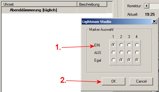 Dazu klciken wir mit der rechten Maustaste auf das Ereignis und wählen "Marker Auswahl": Da wir bei dem betreffenden Aktor ja mit "Marker 1" arbeiten, wählen wir diesen auch hier aus (1) ... ... und klicken auf "OK" (2).