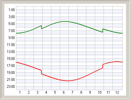 Schaut man sich die dazugehörige Kurve an hat man den Eindruck, die jeweiligen Zeiten folgen exakt den realen Dämmerungs-Zeiten.